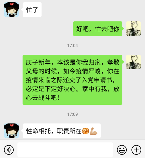 “庚子新年,本该是你我归家,孝敬父母的时候,如今疫情严峻,你在疫情来临之际递交了入党申请书,必定是下定好决心。家中有我,放心去战斗吧!”